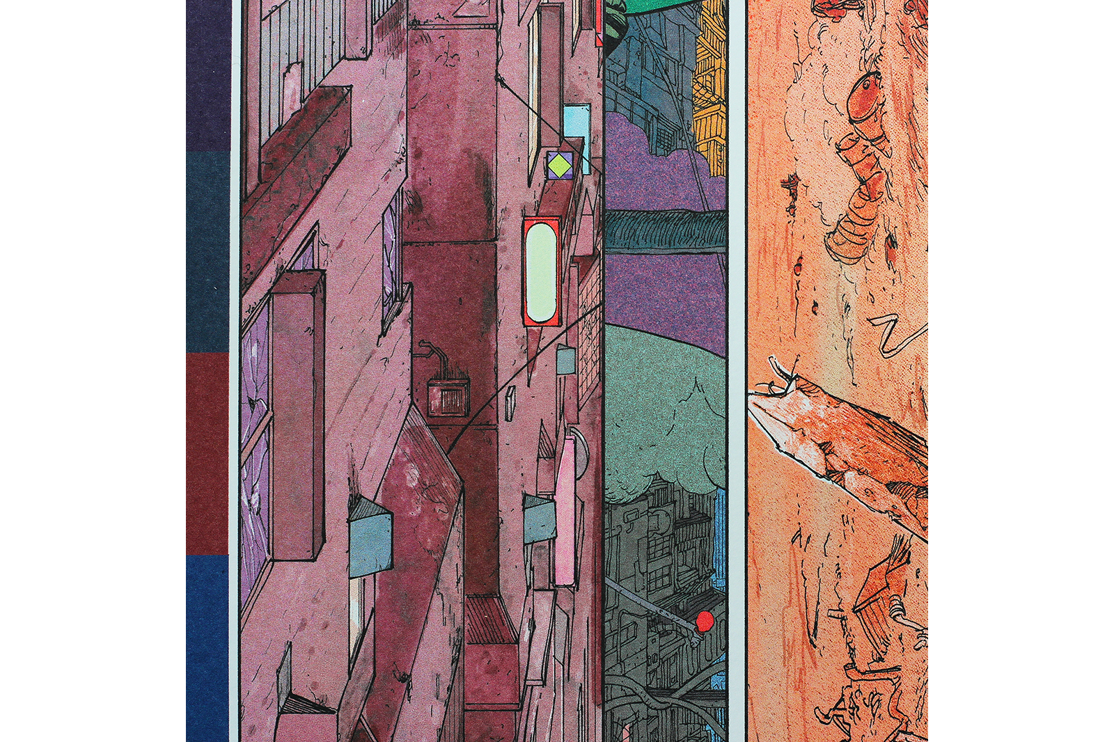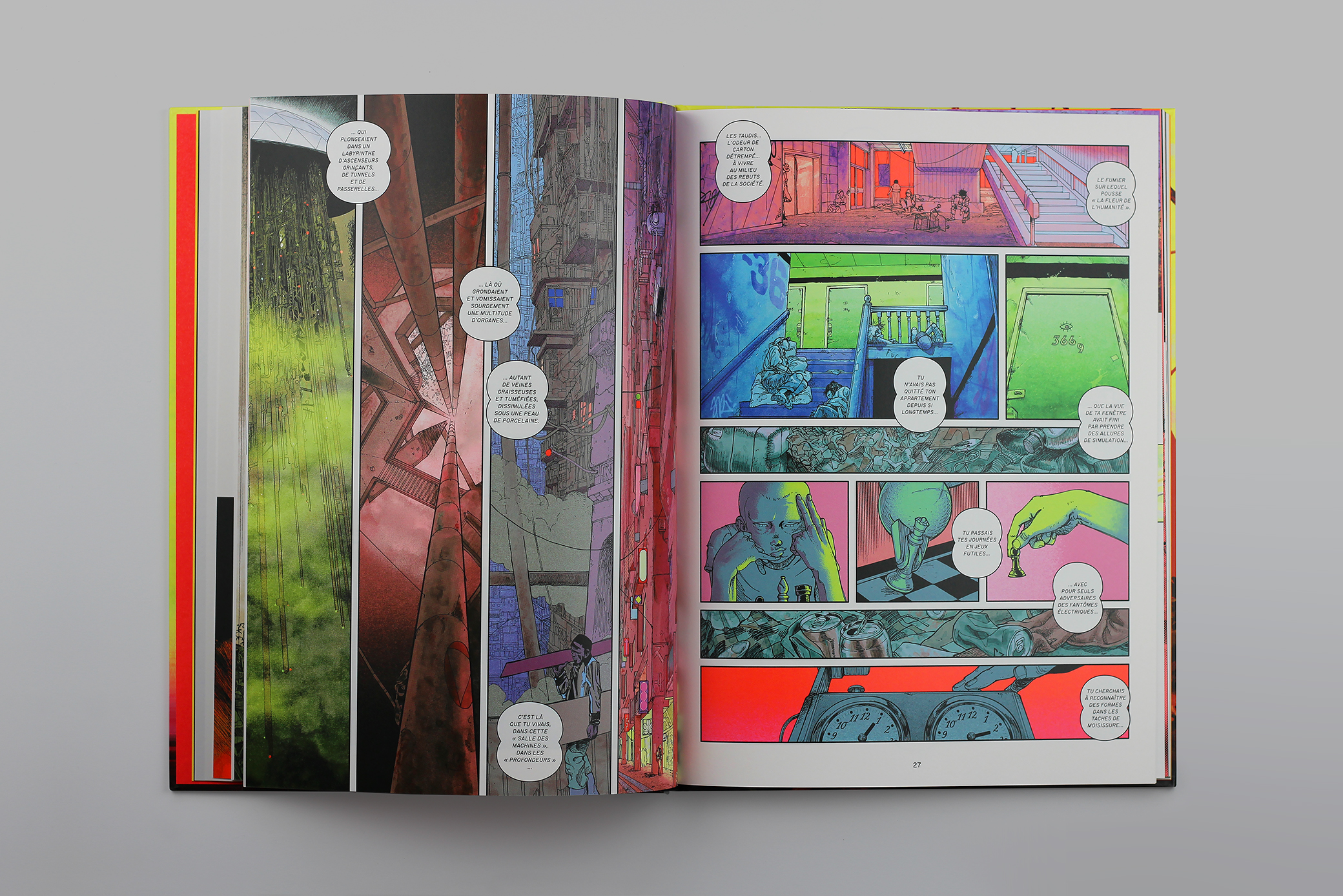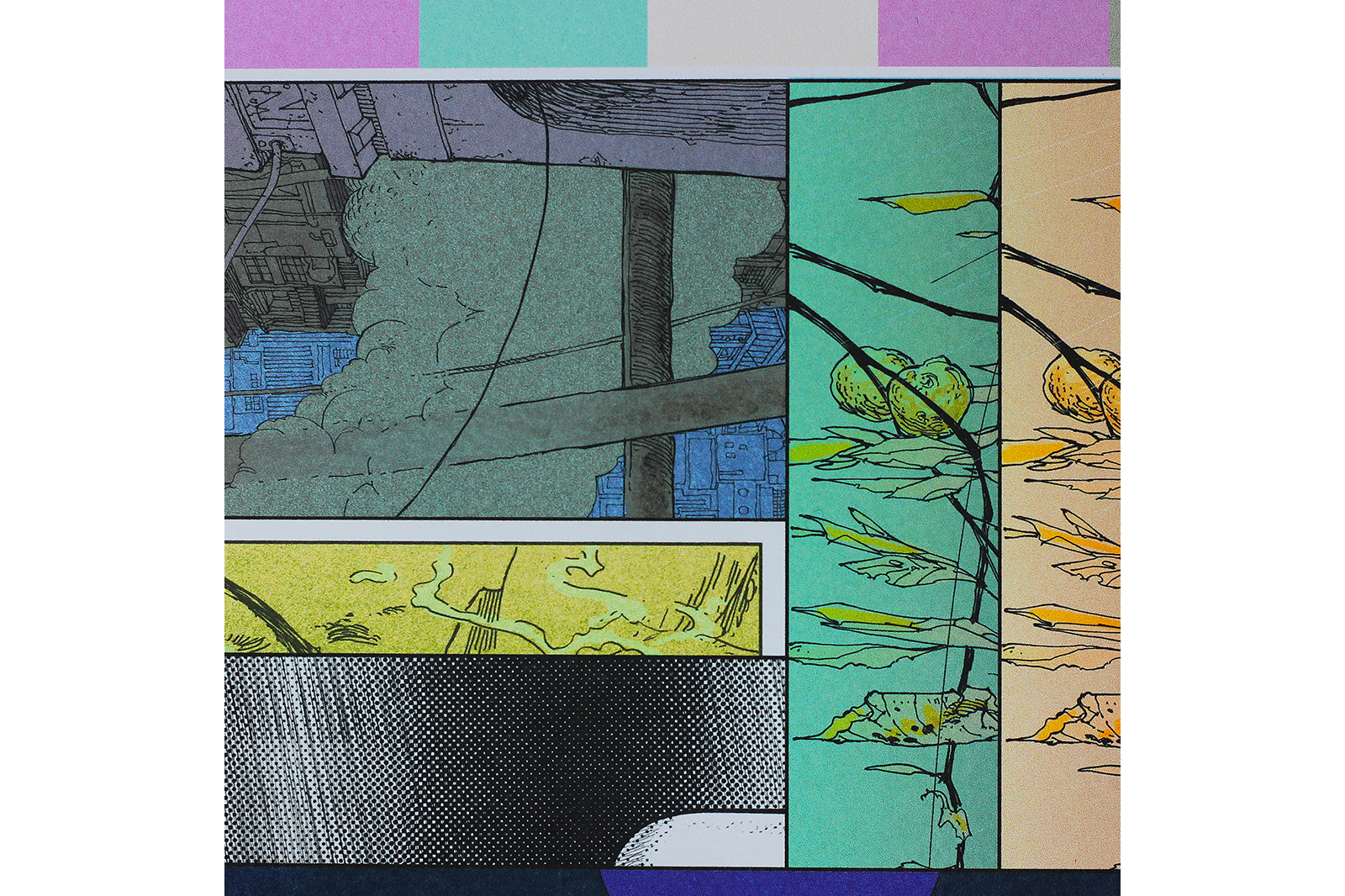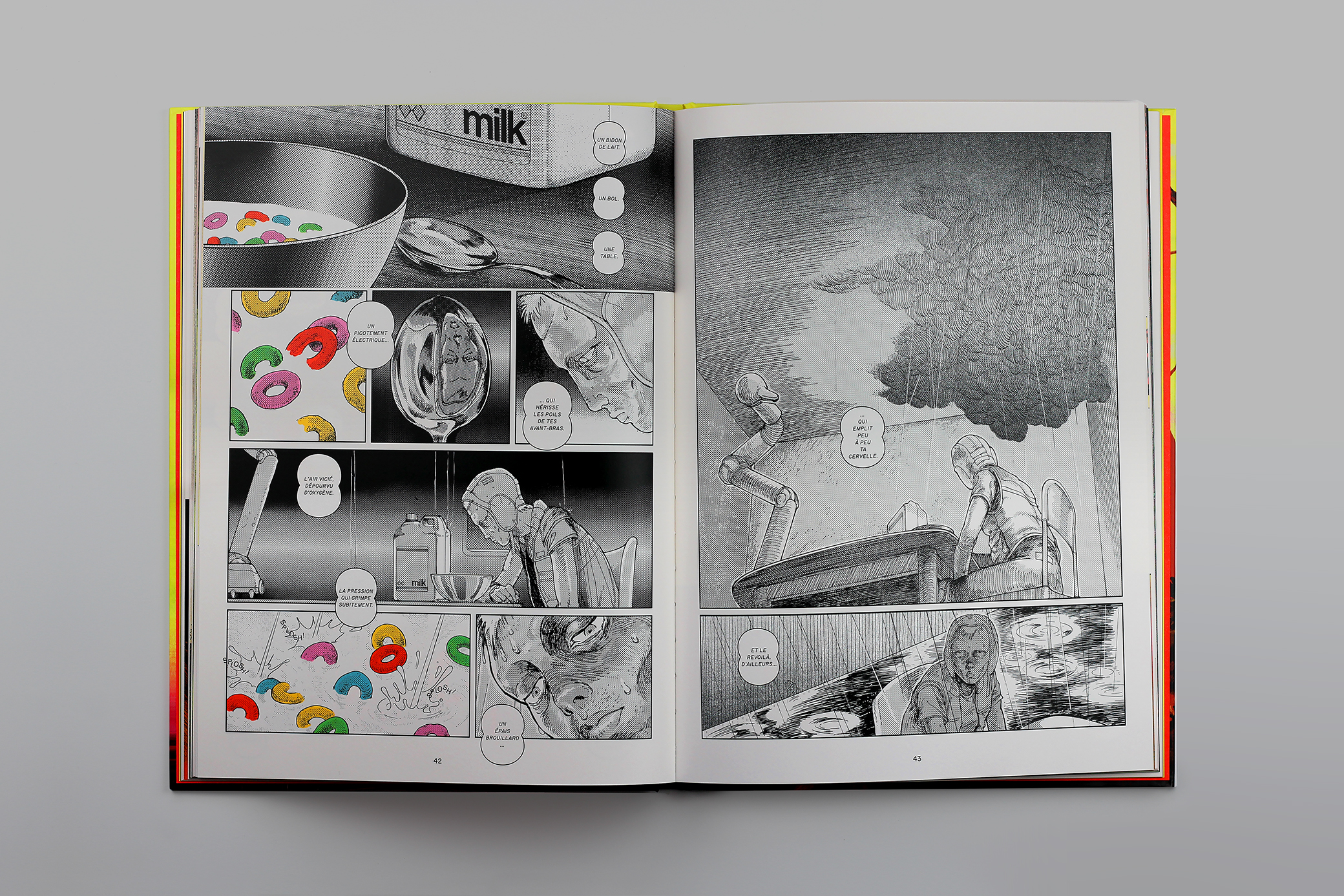 Spanning a continuous series of books published since 2016, I crafted short stories connected through interstitial spreads: vivid, hyper-colored cut-ups that combined panels from various parts of the book. These collages created unique links, highlighting the interconnectedness of the stories. I’ve reintroduced this collage-driven technique in L’Arpenteur, but with a fresh approach. This time, I’ve infused it with more narrative depth. Without revealing too much, the central turning point in the story takes the form of a collage, aiming to convey the blending of the present with memories of the past, where fantasy “bleeds into” reality.