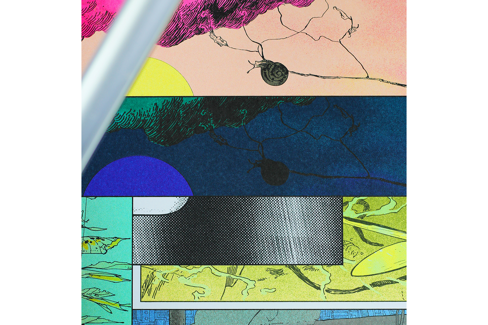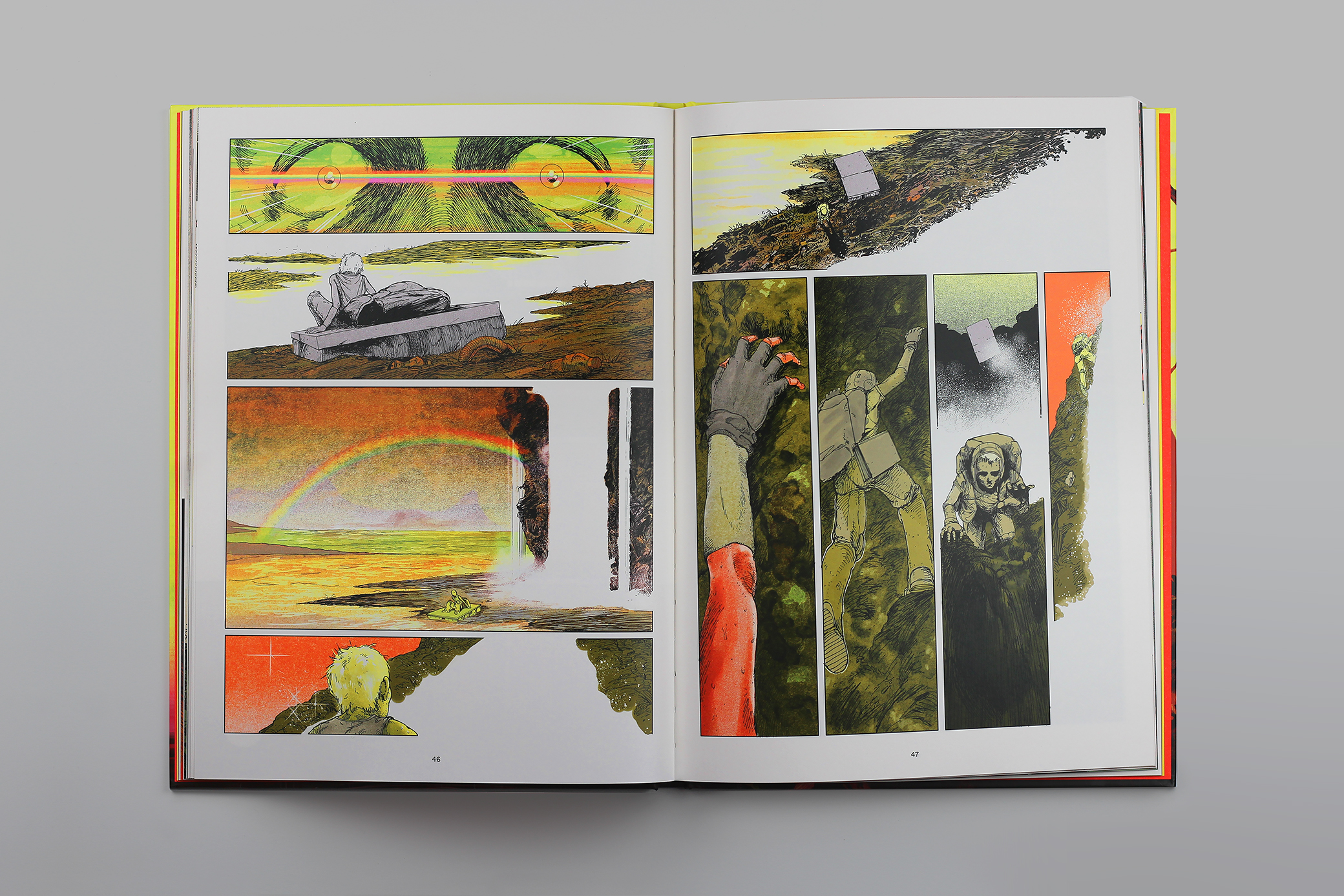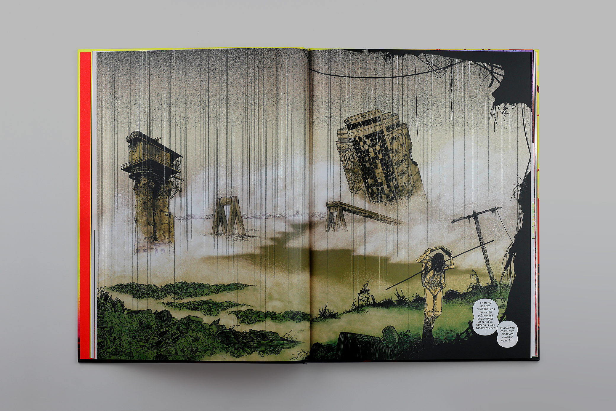 Although L’Arpenteur is tonally distinct, I intended to revisit and integrate elements from my earlier experimental comics, created with British publishing house Landfill Editions. In these earlier books I explored ways to enhance the narrative through paper choice, innovative printing techniques and the use of Pantone spot colors.